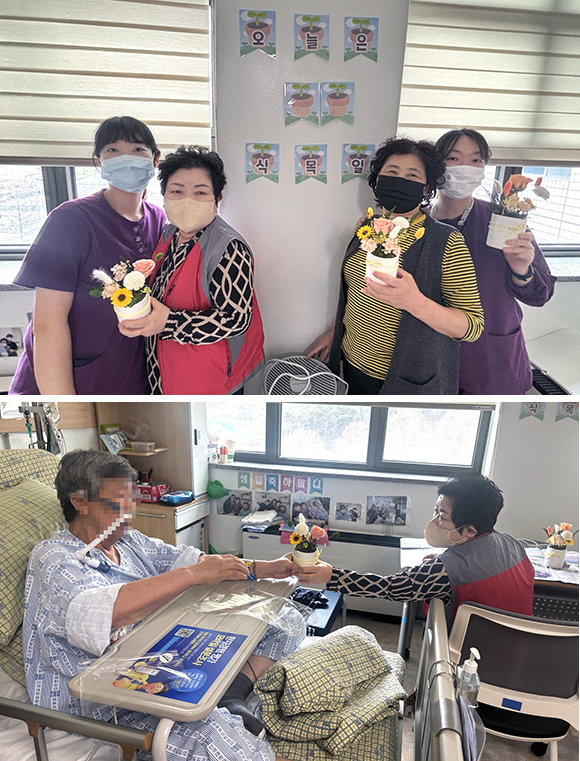 이후 4월 5일에는 식목일을 맞이하여 환자들의 쾌유를 빌고 희망을 나누기 위한 ‘희망 꽂꽂이 행사’가 진행됐다. 완화의료병동 호스피스팀원들은 각 병동을 돌며 식물과 흙 대신에 향이 나는 프리저보드 꽃과 비누 꽃을 화분에 꽂꽂이할 수 있도록 준비하였으며, 컨디션이 좋지 않은 환자는 보호자와 함께 이벤트에 참여할 수 있도록 적극적으로 독려했다.