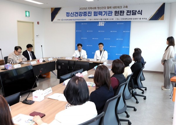 충남 권역책임의료기관인 단국대병원(병원장 김재일)은 23일, 병원 암센터 회의실에서 ‘정신건강증진 협력사업 협력기관 현판 전달식’을 개최했다. 이번 행사는 단국대병원이 중심이 되어 지역 내 상담센터와 의료기관 등 협력기관들과 함께 정신건강 고위험군을 조기에 발견하고, 지속적인 치료·연계를 위한 협력체계 강화를 목적으로 마련됐다.