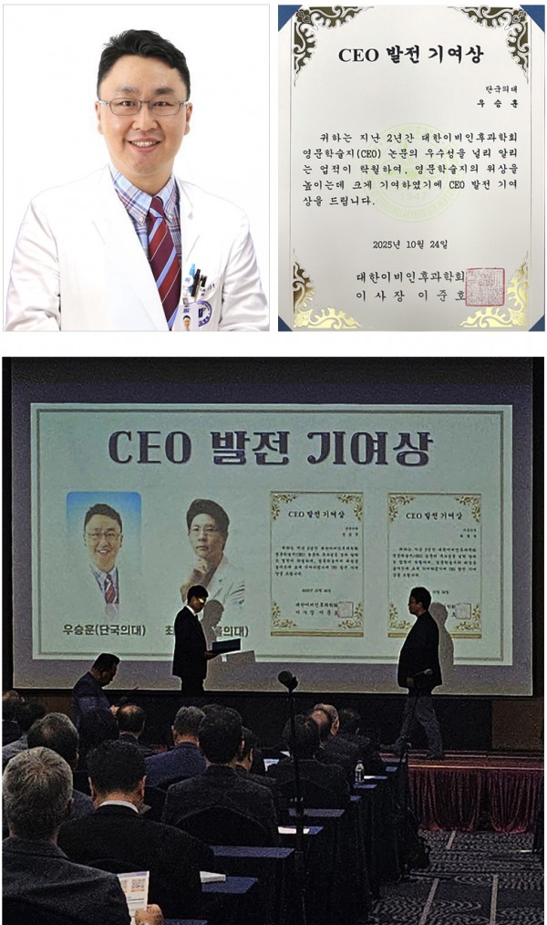이번 수상은 우승훈 교수가 대한이비인후과학회에서 발간하는 SCIE 등재 영문학술지 CEO(Clinical and Experimental Otorhinolaryngology)에 논문을 꾸준히 게재한 결과, 학술지의 위상을 높이는데 기여한 점이 인정되어 이루어졌다.