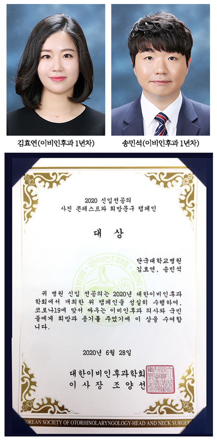 코로나19에 맞서 싸우고 있는 의료진과 국민들에게 희망과 용기를 주기 위해 마련된 ‘2020 신입전공의 사진 콘테스트와 희망문구 캠페인’에서 단국대병원(병원장 김재일) 이비인후과 1년차 전공의들이 대상을 수상했다.