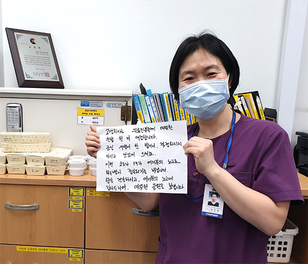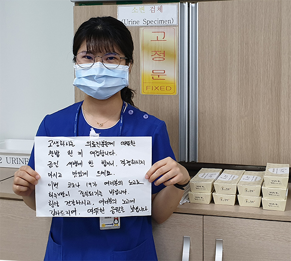 이어 6일 오후에는 천안 신세계백화점 그리다꿈 카페 본점에서도 윤기나는 찰밥 대표가 직접 병원에 방문하여 수제 딸기우유 80병과 찰밥 50인분을 전달하며 의료진에게 응원과 격려의 메시지를 전했다.