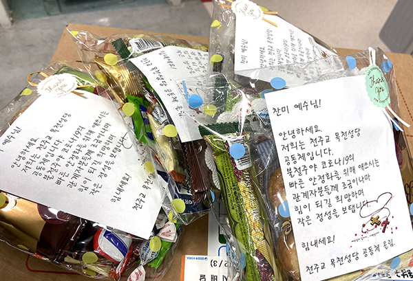 [택배로 배송된 천주교 목천성당에서 보내주신 과자와 간식 - 응원과 격려의 메시지가 눈에 띕니다.
