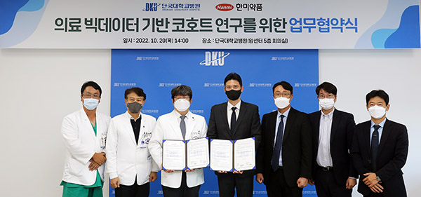 단국대병원은 지난 20일 암센터 회의실에서 한미약품과 의료 빅데이터 기반 코호트 연구를 위한 업무협약을 체결했다. 이번 협약은 양 기관이 보유한 기술 및 역량을 바탕으로 상호 협력하기 위해 마련됐다.