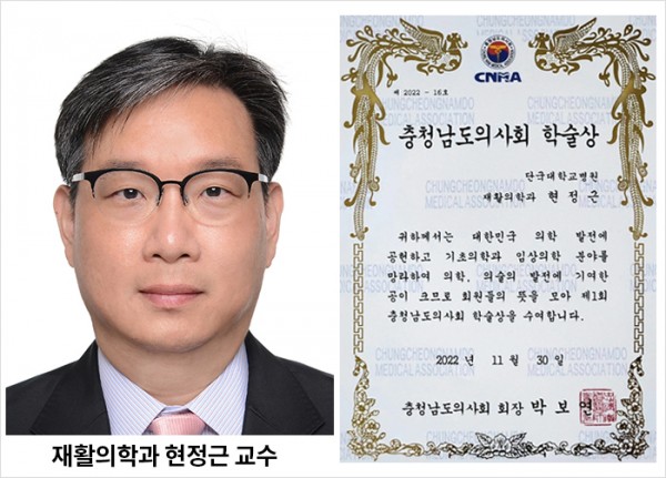 단국대병원 재활의학과 현정근 교수가 제1회 충청남도의사회 학술상을 받았다고 8일 밝혔다. 충청남도의사회 학술상은 올해 처음 제정된 상으로, 충청남도의사회 소속으로 작년 한 해 가장 우수한 연구성과를 이룬 의사에게 수여하는 상이다.