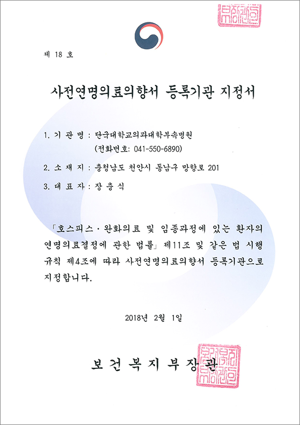 단국대병원, 사전연명의료의향서 등록기관으로 지정 받아
