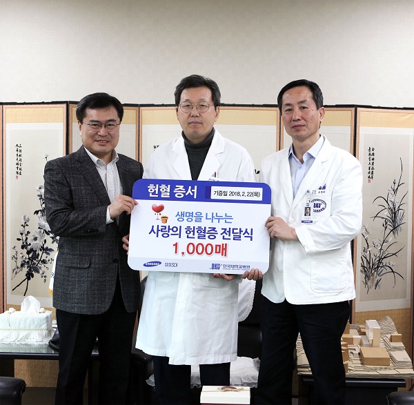 삼성SDI는 2월 22일 단국대병원(병원장 조종태)을 방문해 헌혈 캠페인을 진행하며 모은 헌혈증 1,000매를 전달했다. 이번 기증은 수혈이 필요한 의료취약계층 환자에게 쓰여 이들이 건강한 모습을 되찾아 사회로의 빠른 복귀를 돕기 위한 취지로 마련됐다.