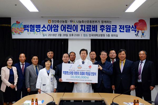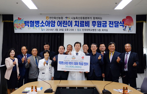 3월 28일 5층 대강당에서는 백혈병소아암 환우들을 후원하는 훈훈한 자리가 마련됐다. (사)한국백혈병소아암협회 충청지회(지회장 박우성/단국대의료원장)는 천안축산농협(조합장 정문영)과 (사)나눔축산운동본부(사무총장 한경섭)로부터 백혈병소아암으로 고통받고 있는 어린이들을 후원하는데 써달라며 5천만 원의 후원금을 전달받았다.