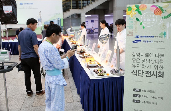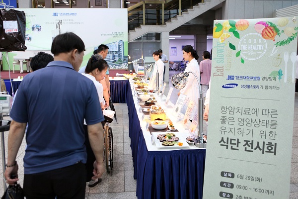 단국대병원 영양팀과 삼성웰스토리가 공동 주관한 이번 행사에는 암환자의 소화기 부작용을 최소화시키면서 영양과 맛을 고려한 20여 가지 메뉴의 맞춤 식단을 선보였다. 또 식단전시회에 참여한 내원객을 대상으로 영양미숫가루와 녹차곤드레주먹밥 등 시식 코너를 운영하여 큰 호응을 얻었다.
