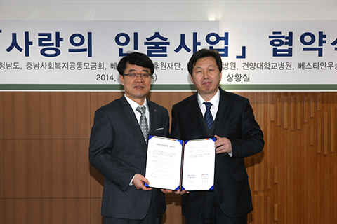 26일 충남도청 상황실에서 도내 저소득층 화상·정형환자 지원을 위한 베스티안 우송병원)과 관계 기관충남사회복지공동모금회, 베스티안 화상후원재단)과의 ‘사랑의 인술사업’ 협약식이 열렸다.