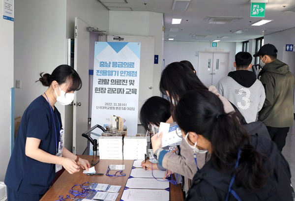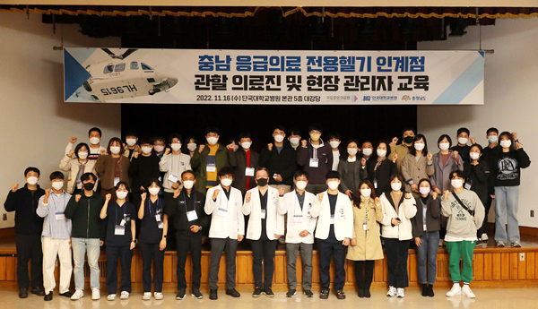 단국대학교병원(병원장 이명용)은 16일 충남 응급의료 전용헬기(닥터헬기) 인계점 관할 의료진과 현장 관리자를 대상으로 환자 인계 및 관리, 운용 방법 등에 대한 교육을 진행했다. 이날 교육에는 충청남도 응급의료업무 관련 공무원과 보건소, 119구급대원, 의무사령부, 해경 등 유관기관 실무자를 비롯해 닥터헬기 출동을 요청하는 병원 의료진 등 60여 명이 참석했다. 교육은 오는 23일 한 차례 더 개최될 예정이다.