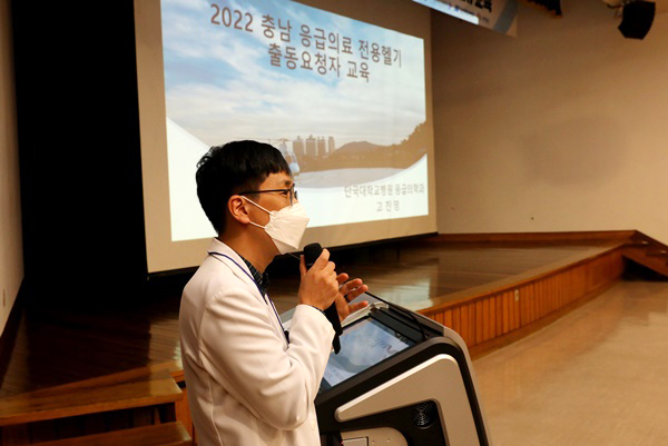 고찬영 충남권역응급의료센터장(응급의학과 과장)은 닥터헬기 개요와 출동 요청자 유의사항 등에 대해 교육했으며, 홍진기 ㈜유아이헬리제트 기장은 인계점 관리 및 운용방법, 인계점 사용 시 주변 통제 및 주의사항 등 인계점 현장 관리자에 대한 안전교육을 이어갔다. 응급의학과 김용오 교수와 최한주 교수는 각각 충남 닥터헬기 환자이송 현황과 코로나 시국의 항공이송을 소개하면서 닥터헬기 출동 요청 절차, 환자 정보 전달체계, 환자 이송 및 인계 방법을 시청각 자료 등을 활용해 자세히 설명했다.