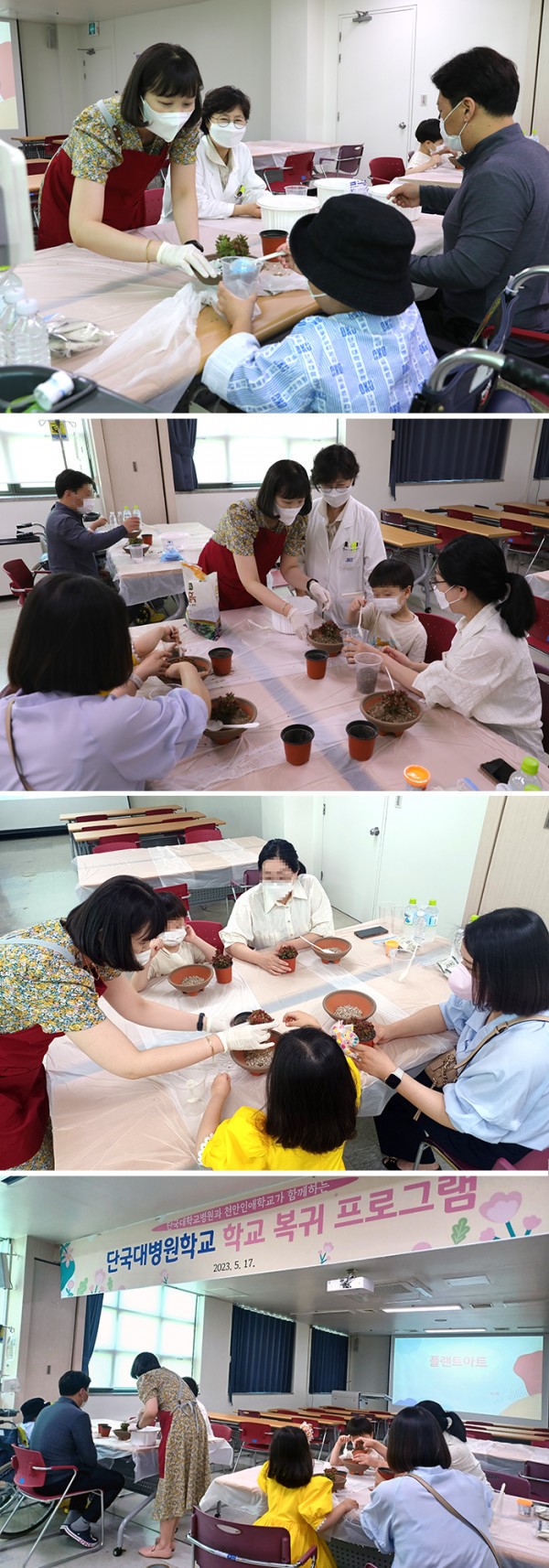 우리 병원은 5월 17일 오후 본관 5층 세미나실에서 환아를 대상으로 ‘단국대학교병원학교 학교복귀 프로그램(원예치료)’을 시행했다. 우리 병원과 천안인애학교가 공동으로 주관한 이번 행사는 환아와 가족들, 사회사업팀 관계자 등 총 10여 명이 함께 하였으며, 병원학교 교장인 소아청소년과 이미정 교수도 함께 했다.