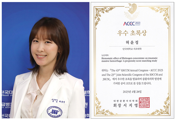 허윤정 교수는 ‘외상성 대량 출혈에서의 피브리노겐 농축제제의 지혈 효과 분석: 성향점수매칭 연구(교신저자: 김동훈 교수)’를 발표해 수상의 영예를 안았다.