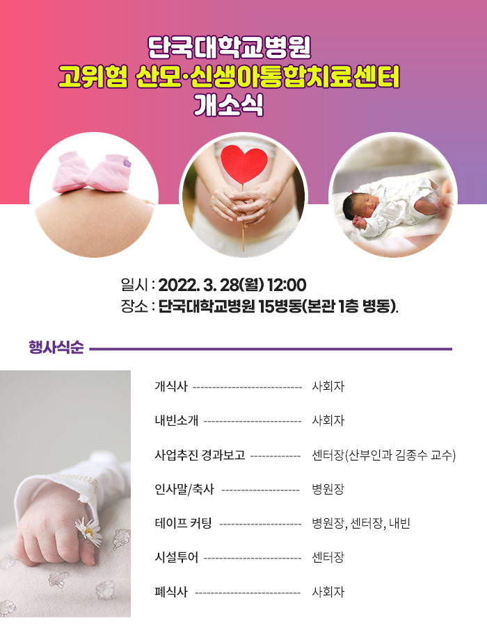 [3.28] 고위험 산모·신생아 통합치료센터 개소식 안내 페이지 정보 작성자 |관리자 작성일 |2022-03-21 13:47 조 회 |7,596회 댓 글 |0건 관련링크 이전글 다음글 목록 본문 [문의] 기획팀(041-550-6013) / 진료지원팀 : 041-550-6030 이전글 다음글 목록