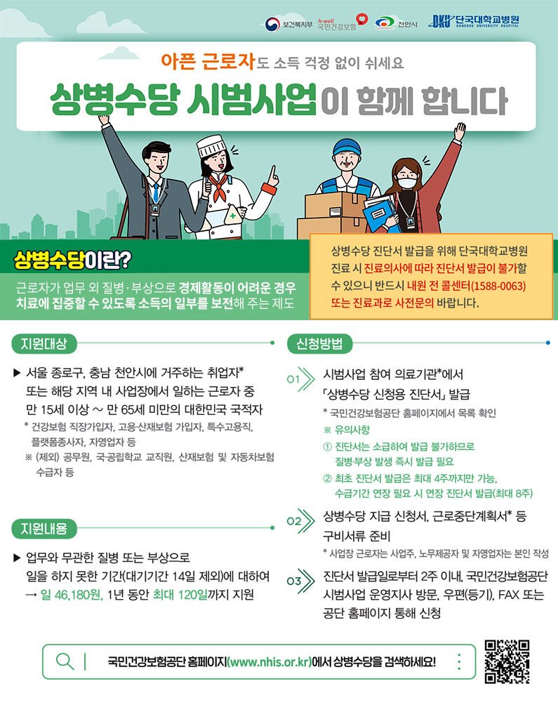 아픈 근로자도 소득걱정없이 쉴 수 있는 '상병수당 시범사업'이 시작됩니다 > 병원소개 > 병원소식 > 공지사항 | 사랑이 숨쉬는 인술의 요람 - 단국대학교병원 홈페이지입니다.