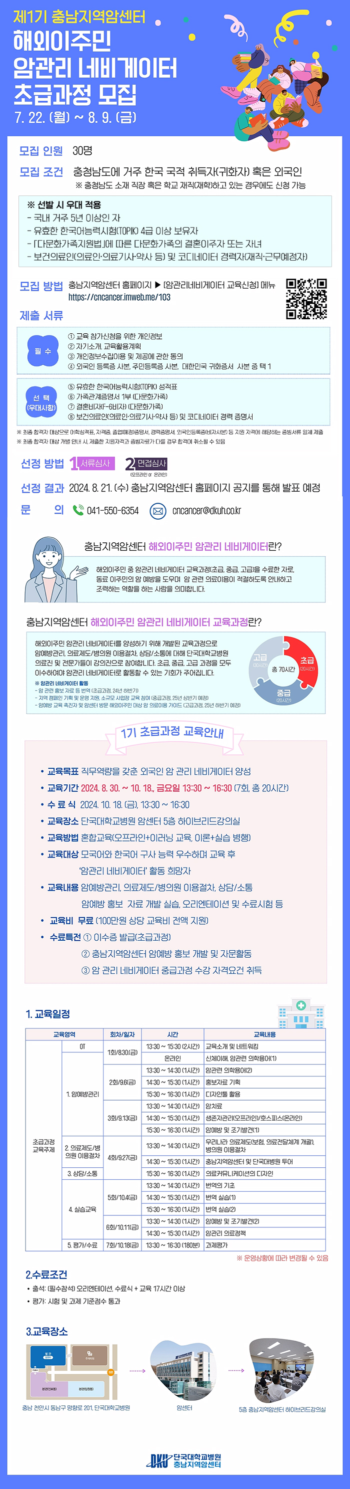 제1기 충남지역암센터 해외이주민 암관리 네비게이터 초급과정 모집 > 병원소개 > 병원소식 > 공지사항 | 사랑이 숨쉬는 인술의 요람 - 단국대학교병원 홈페이지입니다.