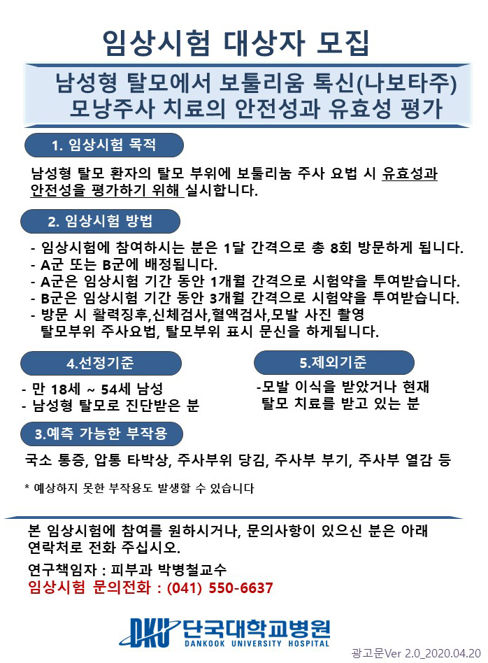 [모집] 남성형 탈모에서 보툴리움 톡신(나보타주) 모낭주사 치료의 안전성과 유효성 평가 > 병원소개 > 병원소식 > 공지사항 | 사랑이 숨쉬는 인술의 요람 - 단국대학교병원 홈페이지입니다.