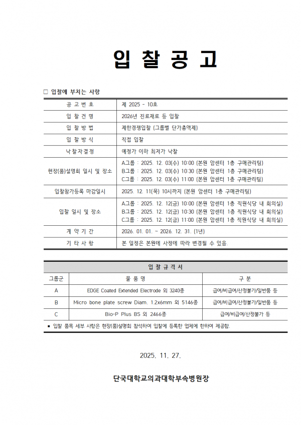 2026년 진료재료 등 입찰 페이지 정보 작성자 |최성수 작성일 |2025-11-27 10:56 조 회 |454회 댓 글 |0건 첨부파일 첨부파일 | 2026년 진료재료 입찰 공고문.hwp (105.5K) 첨부파일 | 현장품설명회 참가신청서.hwp (41.0K) 첨부파일 | 납품실적증명서.hwp (34.5K) 첨부파일 | 입찰참가자격등록신청서.hwp (95.5K) 첨부파일 | 청렴계약 이행 서약서.hwp (64.0K) 첨부파일 | A 그룹 규격서..xlsx (329.5K) 첨부파일 | B 그룹 규격서..xlsx (514.4K) 첨부파일 | C 그룹 규격서.xlsx (246.8K) 관련링크 이전글 다음글 목록 본문 이전글 다음글 목록