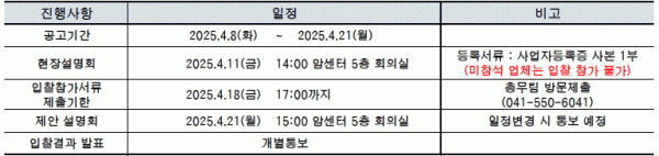 4. 본 공고사항은 본원 사정에 의하여 변경될 수도 있으므로 제안서 제출 전에 반드시 공고사항을 재확인하시기 바라며, 공고내용 중 문의사항은 본원 총무팀(담당자 041-550-6042)으로 문의하시기 바랍니다