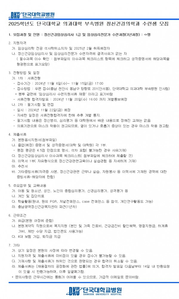 2025학년도 단국대학교 의과대학 부속병원 정신건강의학과 수련생 모집