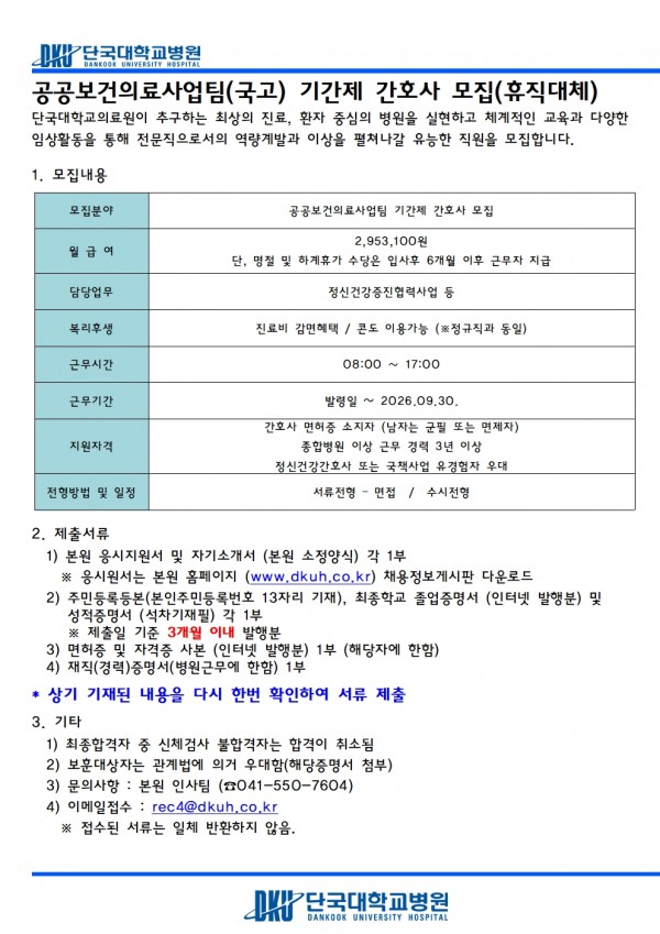 공공보건의료사업팀(국고) 기간제 간호사 모집(휴직대체)