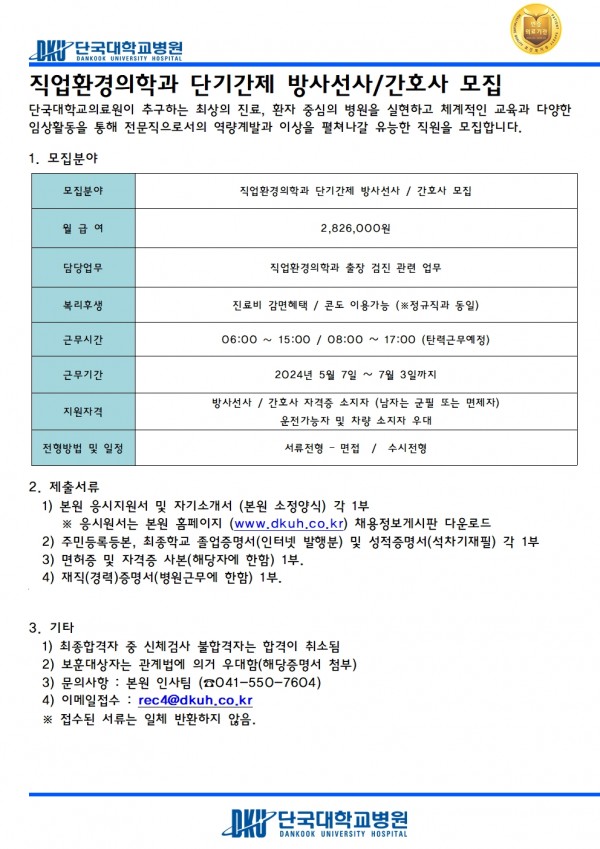 직업환경의학과 단기간제 방사선사/간호사 모집
