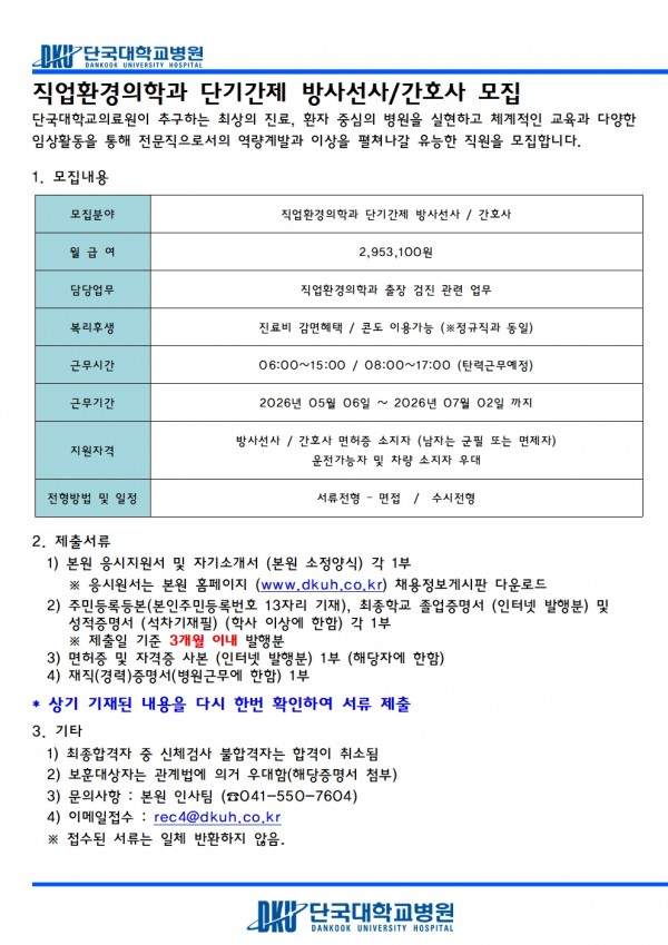 직업환경의학과 단기간제 방사선사 / 간호사 모집
