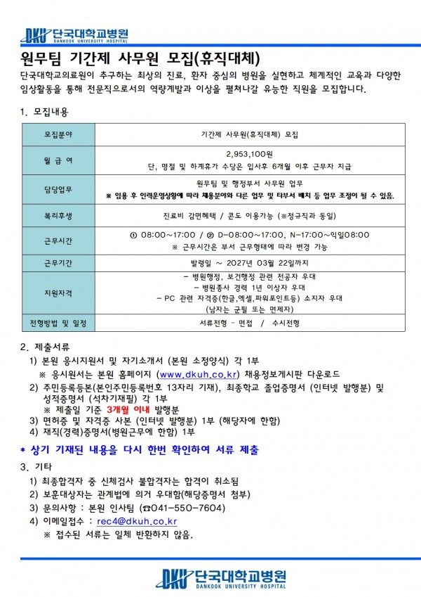 원무팀 기간제 사무원 모집(육아휴직 대체)