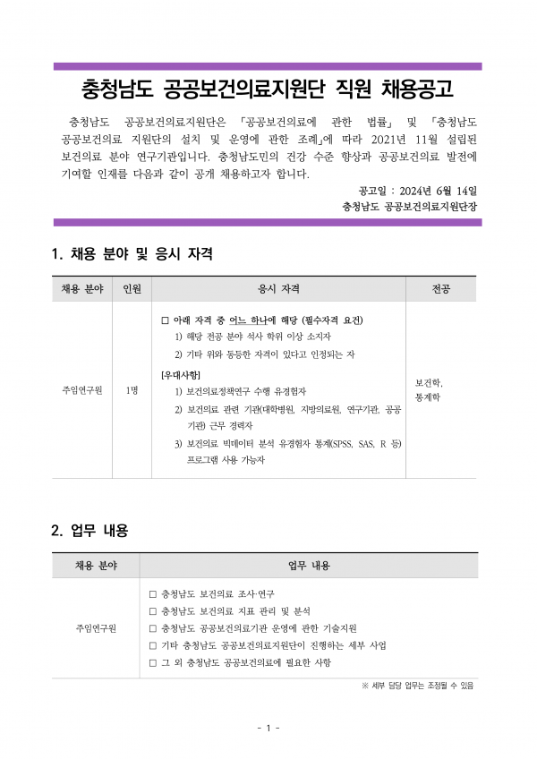 충청남도 공공보건의료지원단 직원 채용공고