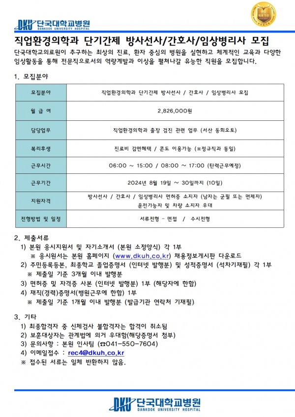 직업환경의학과 단기간제 방사선사/간호사/임상병리사 모집