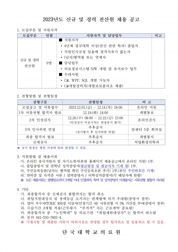 2023년도 신규 및 경력 전산원 채용 공고 페이지 정보 작성자 | 김동진 작성일 | 작성일23-12-01 13:42 조회 | 17,670회 댓글 | 0건 관련링크 이전글 다음글 목록 본문 이전글 다음글 목록