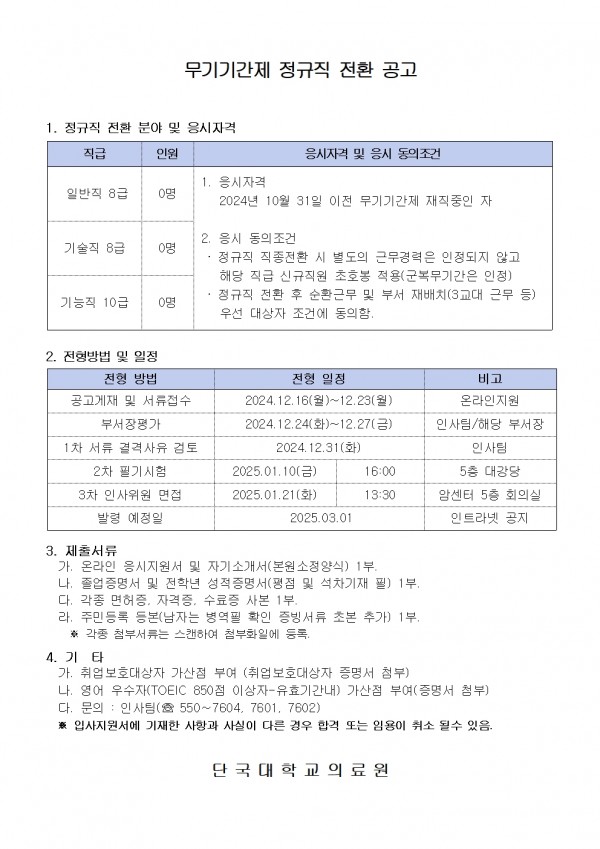 무기기간제 정규직 전환 공고 페이지 정보 작성자 | 이한동 작성일 | 작성일24-12-02 09:26 조회 | 10,414회 댓글 | 0건 관련링크 이전글 다음글 목록 본문 이전글 다음글 목록