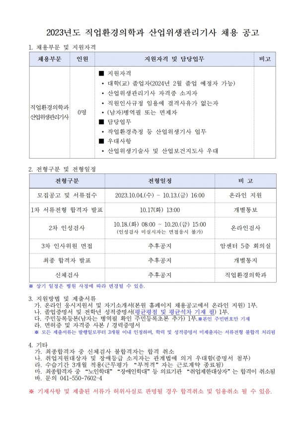 2023년도 직업환경의학과 산업위생관리기사 채용 공고