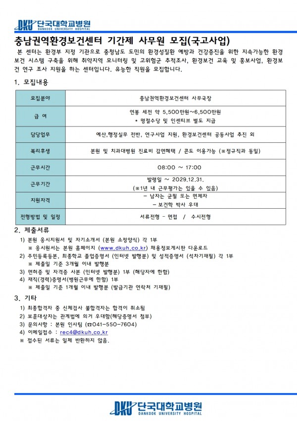 충남권역환경보건센터 기간제 사무원 모집(국고사업)