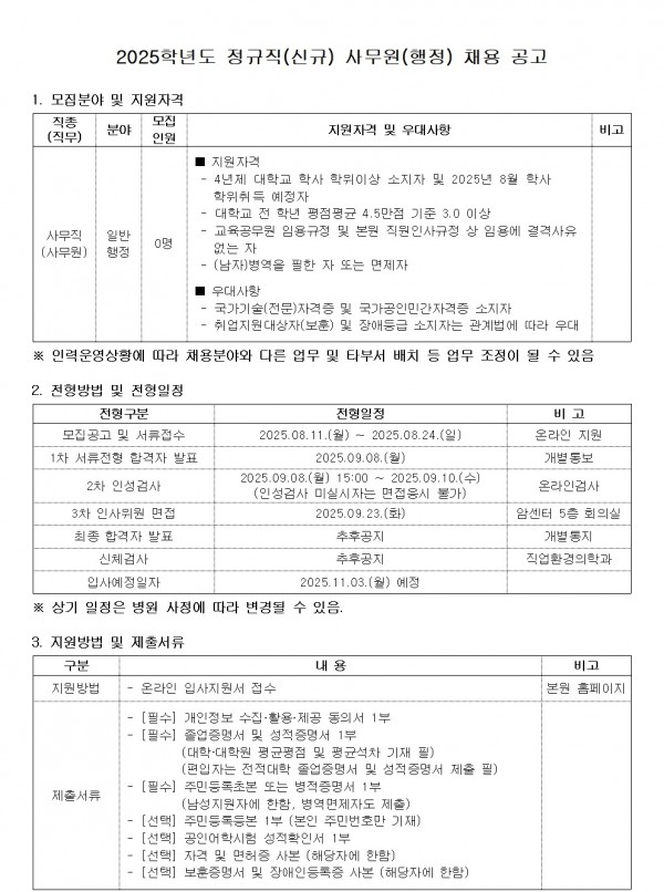 2025학년도 정규직(신규) 사무원(행정) 채용 공고