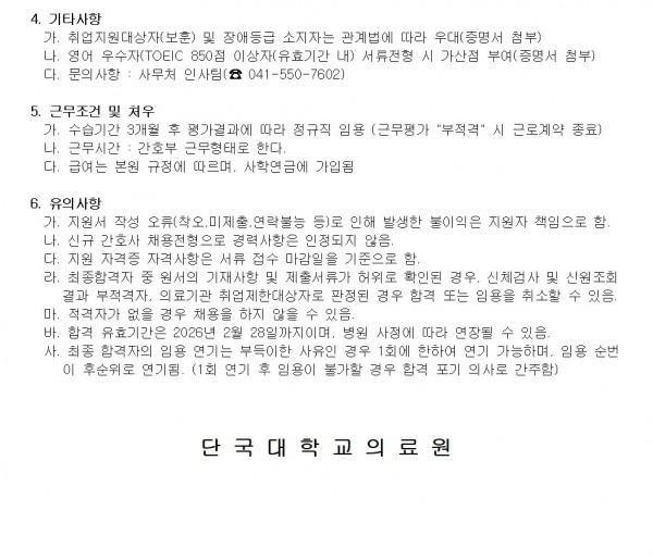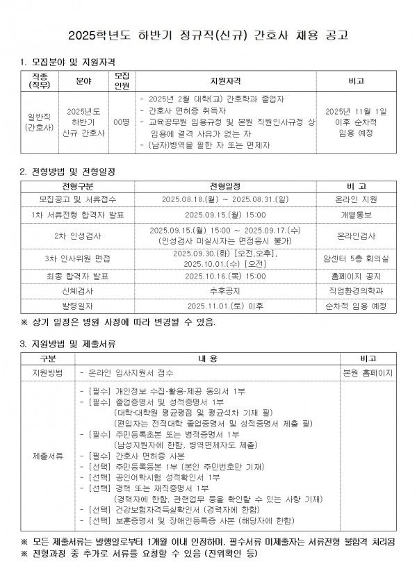 2025학년도 하반기 정규직(신규) 간호사 채용 공고