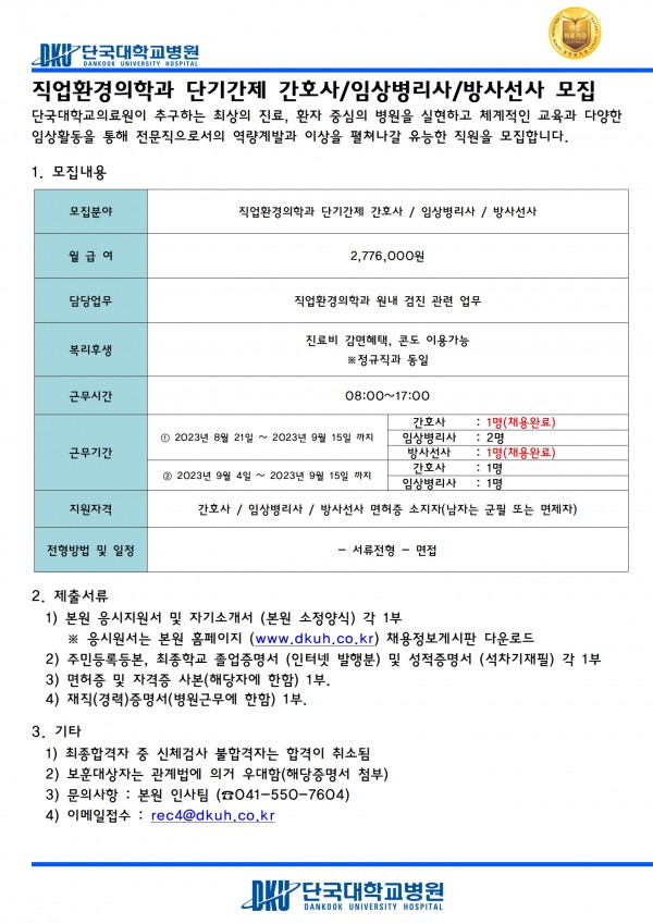 직업환경의학과 단기간제 간호사/임상병리사/방사선사 모집