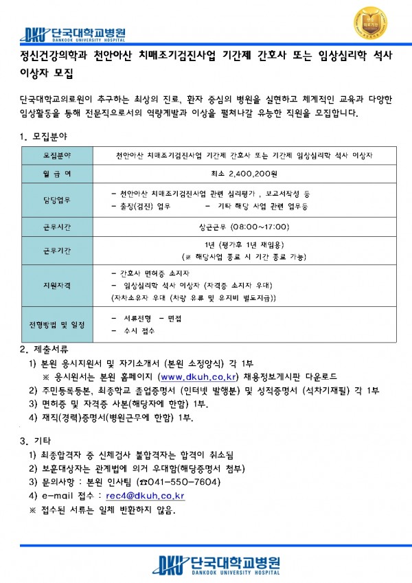 정신건강의학과 천안아산 치매조기검진사업 기간제 간호사 또는 임상심리학 석사 이상자 모집