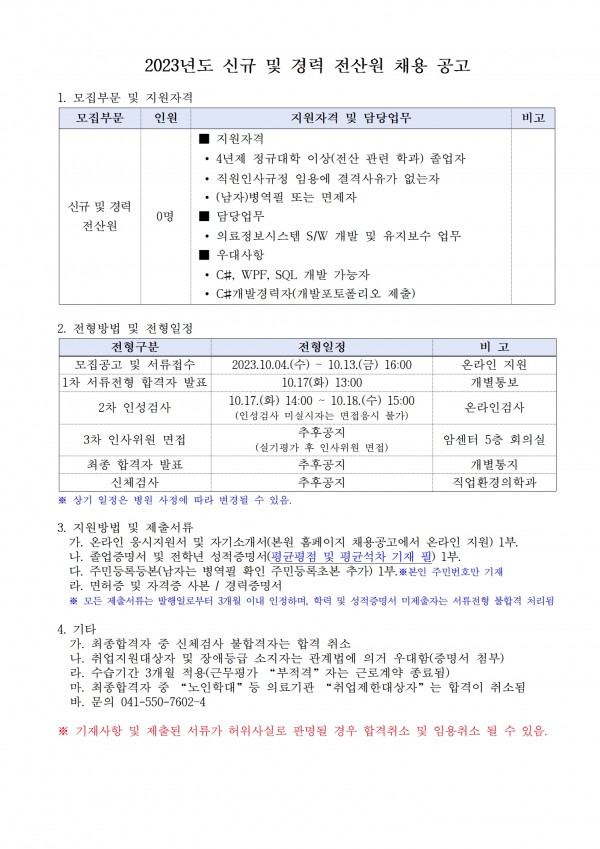 2023년도 신규 및 경력 전산원 채용 공고 페이지 정보 작성자 | 김동진 작성일 | 작성일23-10-04 13:21 조회 | 10,649회 댓글 | 0건 관련링크 이전글 다음글 목록 본문 이전글 다음글 목록