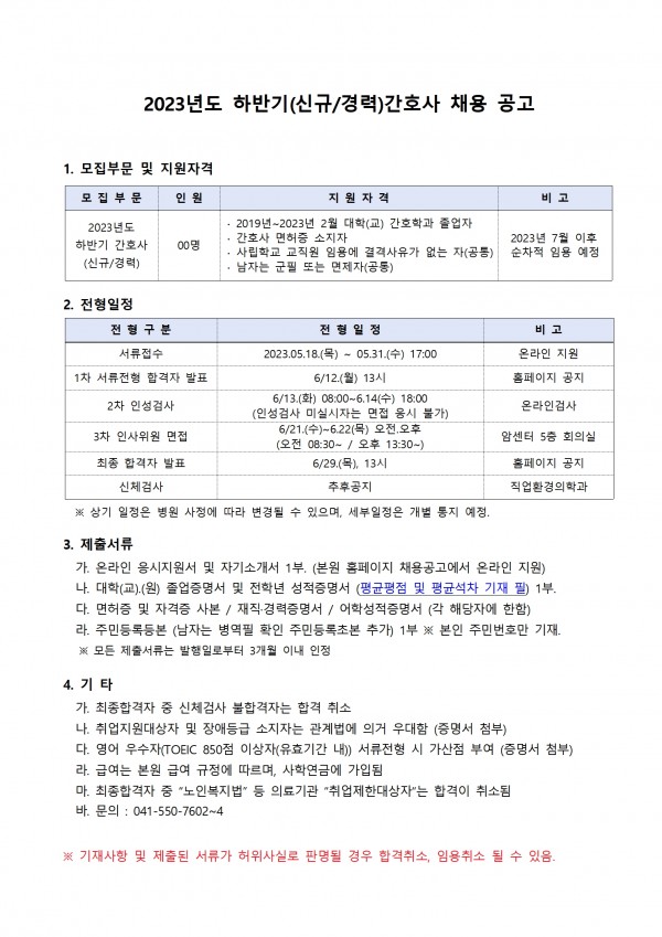 2023년도 하반기(신규/경력) 간호사 채용 페이지 정보 작성자 | 김동진 작성일 | 작성일23-05-12 10:07 조회 | 21,402회 댓글 | 0건 관련링크 이전글 다음글 목록 본문 이전글 다음글 목록