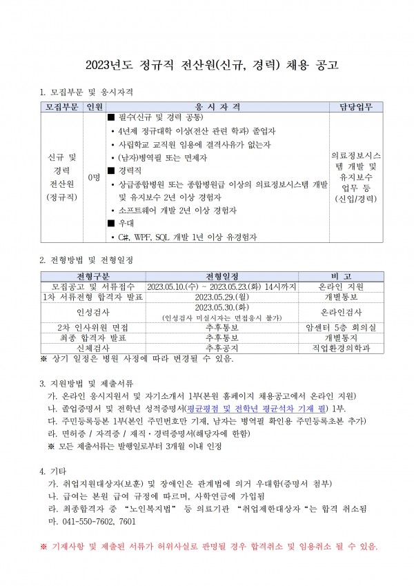 2023년도 정규직 전산원(신규, 경력) 채용 공고 > 병원소개 > 병원소식 > 채용공고 | 사랑이 숨쉬는 인술의 요람 - 단국대학교병원 홈페이지입니다.