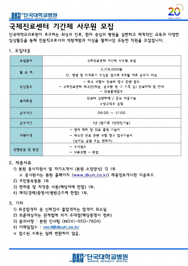 국제진료센터 기간제 사무원 모집