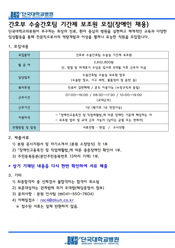 간호부 수술간호팀 기간제 보조원 모집(장애인 채용)