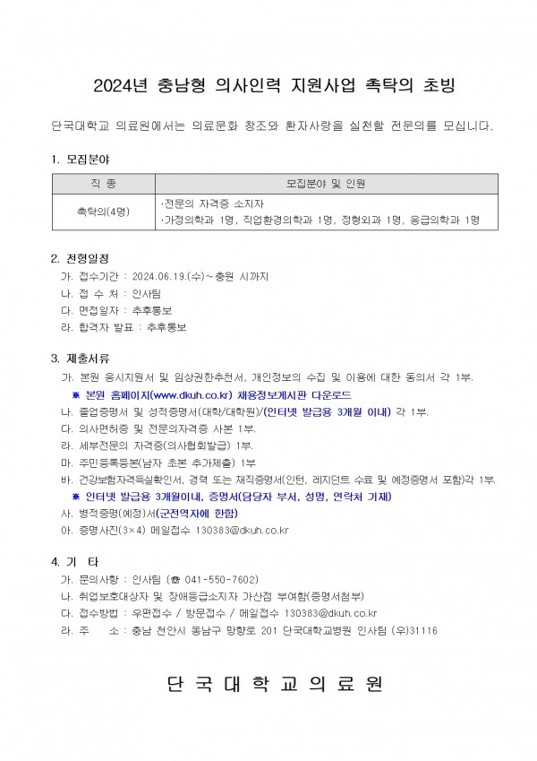 충남형 의사인력 지원사업 촉탁의 초빙 계획