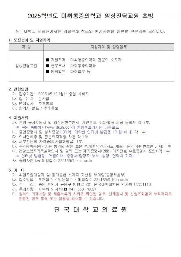 2025학년도 마취통증의학과 임상전담교원 초빙