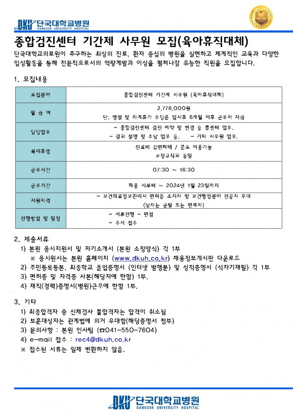 종합검진센터 기간제 사무원 모집(육아휴직대체)