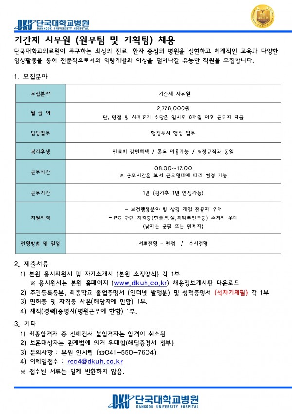 기간제 사무원 (원무팀 및 기획팀) 채용 (원서마감일:2/15)