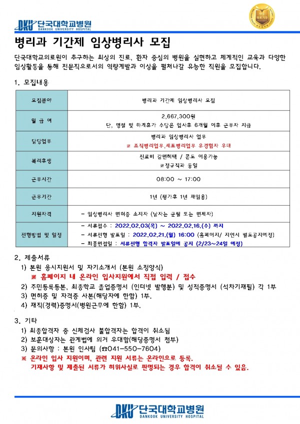 병리과 기간제 임상병리사 모집 페이지 정보 작성자 | 김혜원 작성일 | 작성일22-02-03 13:29 조회 | 17,346회 댓글 | 0건 관련링크 이전글 다음글 목록 본문 이전글 다음글 목록