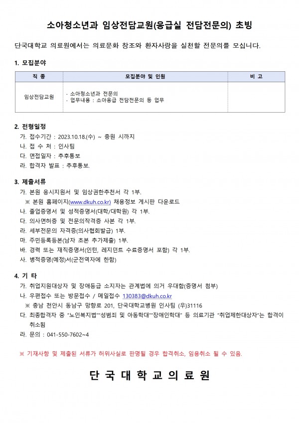 소아청소년과 임상전담교원(응급실 전담전문의) 초빙