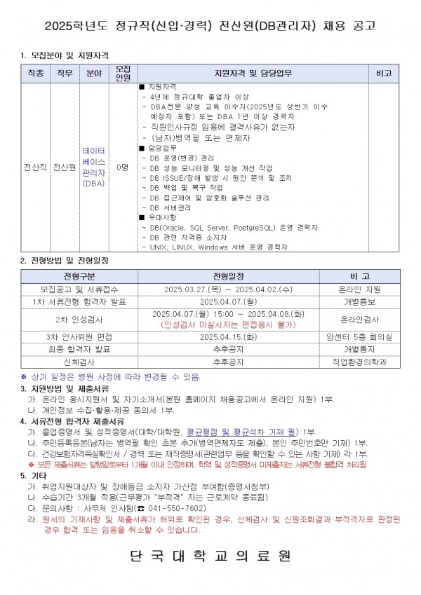 2025학년도 정규직(신입·경력) 전산원(DB관리자) 채용 공고